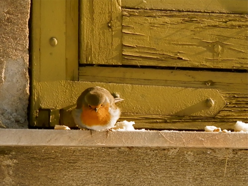 I colori morbidi di davanzale e finestra ben di sposano con il piumaggio del pettirosso. La posizione dell'uccellino suscita tenerezza. ![]() |