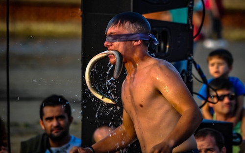 la gara consiste nel catturate solo con la bocca un'Anguilla (Bisàt) immergendo la testa in un catino capiente con dentro 5 anguille libere nell'acqua, il tutto bendati come si può vedere.