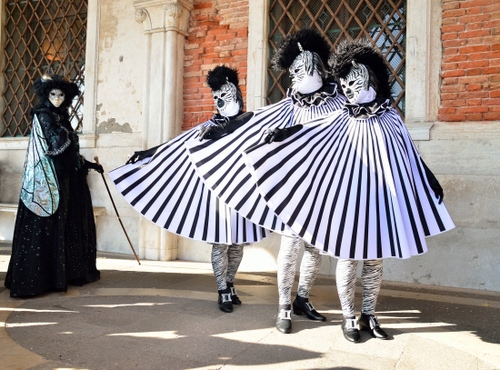 Costruzione della foto valida, la visuale va da destra a sinistra quindi ben architettata. Linee cadendi sia a destra che sinistra non ottimali soprattutto a destra dove risulta leggermente storta. Abbastanza fastidiosa la proiezione dei raggi solari, soprattutto sul corpo della prima e seconda maschera. Buono il contrasto dinamico tra i tre primi soggetti zebrati con la maschera nera sullo sfondo sinistro.Infine linea dell'orizzonte nella parte alta migliorabile, si poteva dare un maggior bilanciamento in generale all'inclinazione dell'immagine. |
