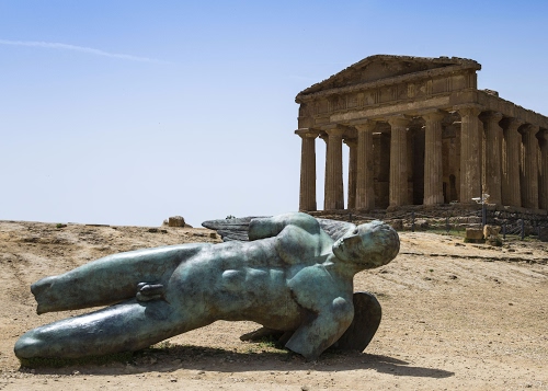 Tag: tempio, colonne, statua, bronzo, cielo, azzurro, antichità, terra, agrigento, rudere, greco, scultura, archeologia, rovine, timpano.