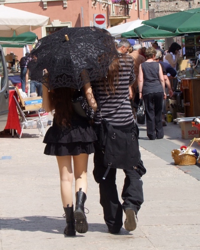 Altri tag (senza riscontro): ombra, strada, parasole, vestito, abiti, neri, passeggiando, ombrelloni, anfibi, sottobraccio, due, piazza, giovani, passanti, gonna, sole, gambe.