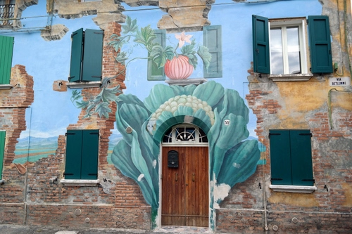 La piazzetta, situata nel centro storico di San Giovanni in Persiceto, è stata ribattezzata “La piazzetta degli inganni” per via dei coloratissimi dipinti trompe l’oeil.