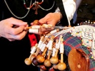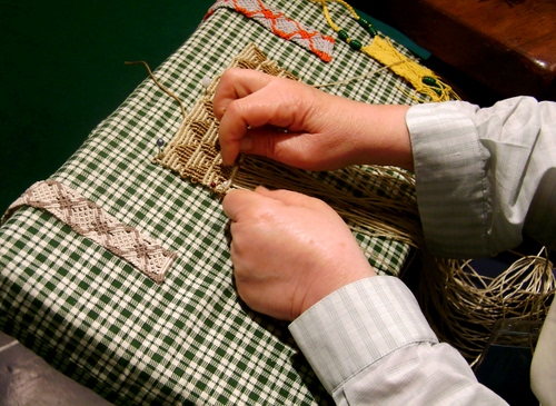 Le mani esperte di una sapiente signora intrecciano i fili della matassa.