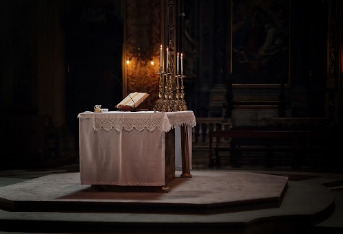 Altri tag (senza riscontro): telo, ampolline, microfono, paramenti, buio, dipinto, lampadari, gradini, interno, scalini, bibbia, banchi, quadro, ombre, cera.