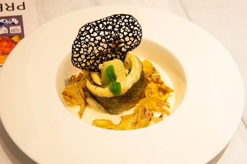 71° Treccina di nasello, verdure al naturale,salsa di gamberi e carciofo fritto | 150° calamaro ripieno con vellutata di asparagi e pomodorino confit |