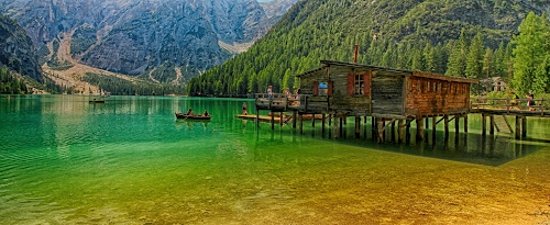 E' il lago di Braies che è diventato il più famoso d'Italia grazie alla serie televisiva "Ad un passo dal cielo" e quella è la palafitta del noleggio barche dove venivano girate le scene fino dello scorso anno. Magari ripreso in questo modo per esaltare i colori dell'acqua perde alcune sue caratteristiche quali la Croda di Becco nello sfondo. |