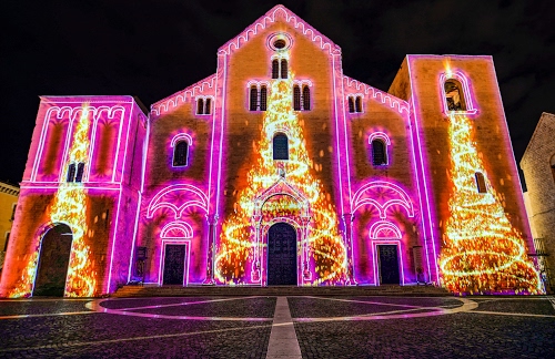 Altri tag (senza riscontro): alberi, disegni, festa, campanile, sagrato, cattedrale, porta, proiezioni, cerchi, natalizia, facciata, portoni, arancioni, gialli, proiettati, sera, righe, piazzale.