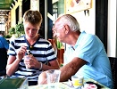 Chissà cosa si stavano dicendo. Di fronte a lei era seduta una sua amica che nella foto non si vede. |