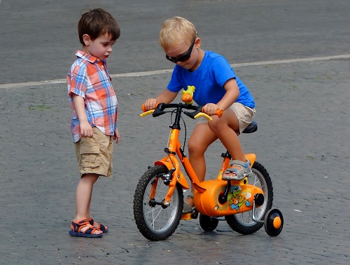 @Oscaruccio: Dipende come vengono forgiati / plagiati da adulti. I bambini sono delle spugne e assorbono quello che vivono e percpiscono intorno. @Dominique: Grazie I due ragazzi stavano giocando e si stavano divertendo insieme... Ho scattato anni fa una serie di foto e solo in questa la sensazione è quella che uno invidia l'altro "fighetto" con gli occhiali da sole e la bici nuova. |