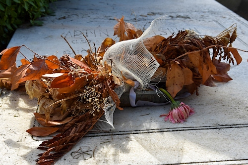 Altri tag (senza riscontro): estinto, malinconia, piante, defunto, omaggio, retina, camposanto, abbandono, morire, tulle, autunno, iscrizioni, fogli, scritte, stelo, ricordi, morti, dolore, lapide, righe, rami.