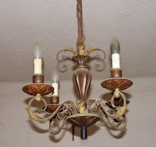 Lampadario del 1962, intagliato a mano da mio padre per conto di una ditta del lecchese. Una serie destinata all'esportazione, è stata prodotta procurando nel legno ancora liscio, una finta antichizzazione (cariolature) che diventò appetibile agli occhi inesperti. (in che modo veniva fatta non lo scrivo, ma l'operazione è di una semplicità imbarazzante, comunque oggi quella modalità sarebbe vietata).