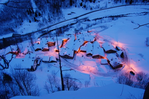 Altri tag (senza riscontro): notte, rifugio, paesaggio, villette, fiaba, blu, albero, villaggio, case, luce, atmosfera.