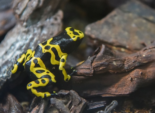 Tag: giallo, anfibio, nero, rana, zampe, bicolore, rocce, tronco, roccia, sassi, macchie.