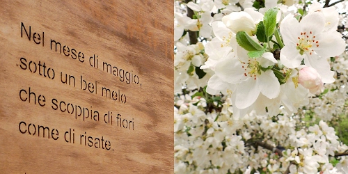 A sx un frammento della poesia del premio Nobel polacco Wisława Szymborska, “Il Melo”, fotografato all'ingresso del padiglione polacco a EXPO 2015 a Milano.