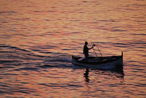Alla calma del mattino si contrappone il rumore del motore marino della barca. Il colore livido del mare descrive un'alba appena cominciata ed accompagna il ritorno del pescatore con le reti tirate a bordo e cariche di pesce. Ottima la scelta della inquadatura con la barca sulla destra e la scia che danno movimento alla foto e la sensazione di velocità. Il controluce mette il pescatore in silouette mentre la barca è pienamente visibile e descritta anche nell'interno. Qualche perplessità nel colore del mare che avrei vivacizzato nei colori rosso e giallo e blu, corretti invece la luminosità ed il contrasto. |