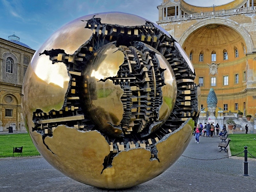 Altri tag (senza riscontro): museo, balaustra, prato, rotondo, passanti, parco, recinzione, pigna, gente, palazzi, riflesso, sculture, cielo, cupola, catena, turisti, terrazzo, metallico, cerchio, meccanismo, colore, edifici, incisioni, giallo, visitatori, ingranaggi.