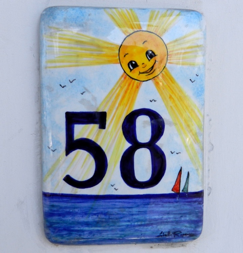 Altri tag (senza riscontro): targa, mattonella, giallo, azzurro, civico, cielo, maiolica, cinquantotto, firma.