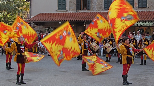 Altri tag (senza riscontro): palo, triangoli, nero, festa, piazza, aste, sbandierare, rosse, stemma, rievocazione, bandiera, calzemaglia, case, figuranti, stoffa, simbolo, pubblico, sventolare, tegole, uniforme, retto, asta, vento, triangolo, gialle, visi.