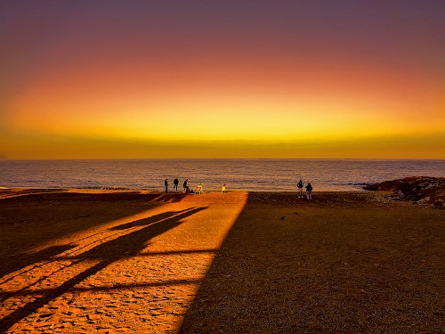 Di sera si allungano le ombre sulla spiaggia di Albenga (Liguria)