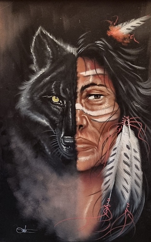 Una pittura su base di velluto rappresentante l'anima del lupo di un nativo americano.