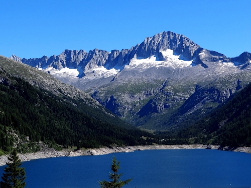 Dal lago artificiale di malga Bissina di fronte a noi si erge la mole imponente del Carè Alto 3463 m.
