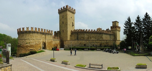 Tag: castello, piazza, alberi, merli, panchina, torre, torri, passanti.