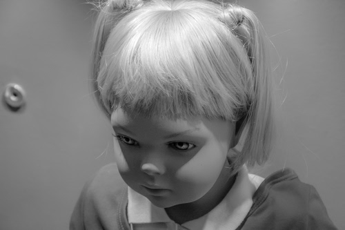 Non so Rob se hai visto un vecchio film di fantascienza, "Il villaggio dei dannati" - la bambola assomiglia parecchio ai protagonisti bambini. http://www.bookandnegative.com/antologia-del-cinema/il-villaggio-dei-dannati-1960/ |