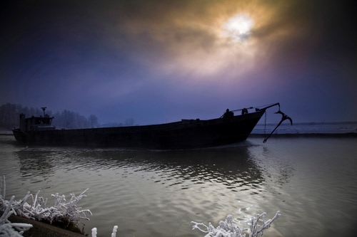 Una sensazione di freddo intenso, pungente in una atmosfera nordica, crepuscolare e livida. La nave in lenta navigazione nel canale e la luce fioca danno una sensazione di calma apparente e di silenzio. E' palpabile il torpore dell'atmosfera indotto dal gelo, dal cielo nuvoloso e dall'ora mattutina. L'inquadratura è decisamente da raddrizzare, inoltre è un vero peccato aver tagliato i rami gelati in primo piano che avrebbero contribuito maggiormente all'effetto di contrasto con il nero della fiancata della nave ed avrebbero descritto al meglio la sensazione di freddo. Belli i colori e corretta la scelta di scurire gli angoli della foto.. |