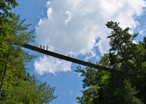 questo ponte sospeso passa sopra un canyon in cui scende una cascata; c'è un percorso che risale lungo la cascata ed il ponte unisce i due lati del canyon.Ho scattato la foto dal basso all'inizio del sentiero |