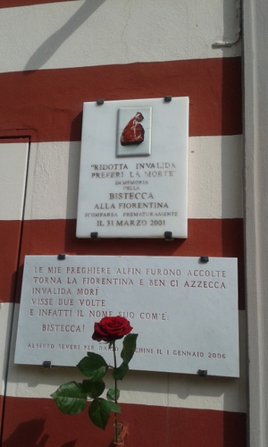 Beh, le lapidi sono ovviamente scherzose. Il macellaio è un "personaggio", apparso spesso anche in tv, che vende la carne declamando la divina commedia. Vende anche carne di bistecca sottovuoto assolutamente fantastica. |