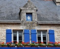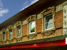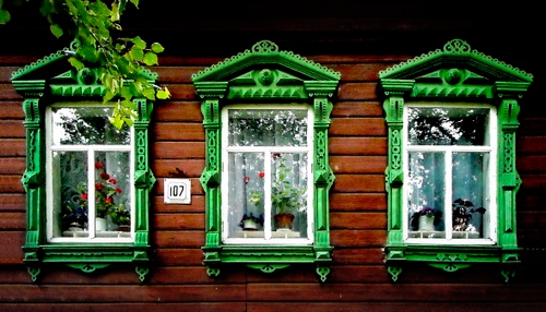 Bellissime le cornici ornamentali verdi in contrasto con il bianco degli infissi e il legno della casa. |