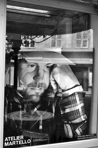 riflesso della piazza nella vetrina di un atelier a grasse, capitale mondiale dei profumi, in costa azzurra.