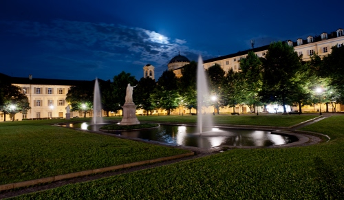 I riflessi della luna danno luminosità allo specchio d'acqua di questa fontana nel centro di Torino