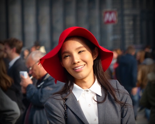Mi accodo a concordare con Rip. Immaginavo potesse essere uno scatto rubato - il sorriso della ragazza e il contrasto fra il rosso del cappello e il grigiore dello sfondo rendono lo scatto ottimo. Complimenti ancora. |