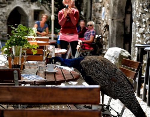 Ristorante a Trento. Il cliente seduto al tavolo aspettava il caffè impaziente si è alzato per andare in bagno, nel frattempo il caffè è arrivato ed il pavone pian piano né ha approfittato. |