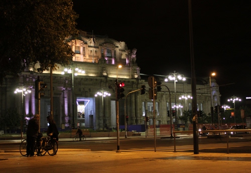 Veduta notturna della facciata della stazione di Milano Centrale.
