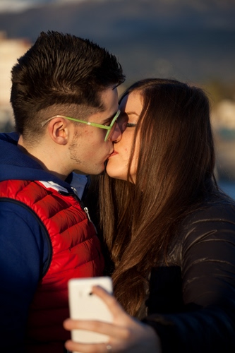 Due giovani al'aperto, in mezzo alla gente, si baciano perché si piacciono.... o perché vogliono vedere poi sul telefono che effetto che fa?