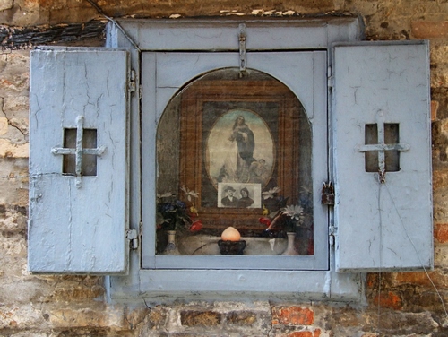 Edicola sacra a Urbino. Trovo affascinanti questi piccoli altari dove il culto popolare si esprime, talvolta, in maniera fantasiosa ma sempre piena di devozione al santo di turno. Mi ha incuriosito la presenza della foto di due persone, un uomo e una donna: chi sono? Forse marito e moglie, fratelli, genitori? Quale storia! Qualcuno li ha adagiati lì, così che la Vergine li proteggesse, e sembrano guardare i passanti sperando che qualcuno posi lo sguardo e , magari, dica una preghiera in loro suffragio.Ed io, ho fotografato quel pezzetto di memoria,una, due, tre volte, fino ad ottenere la foto che mi sembrava più riuscita, per poi notare, DUE persone, DUE ante, DUE croci, DUE anime. Si, mi sono segnata, ho lasciato il mio suffragio e sono passata oltre. Quale storia?