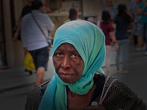 In effetti la donna ha uno sguardo particolarmente espressivo ma ci sono troppi elementi di disturbo attorno a lei per cui, tra cambiare lo sfondo, sfocarlo oppure oscurarlo parzialmente ho scelto la terza possibilità. La soluzione ideale sarebbe stata la prima, ma essendo io un patito della street photography, i fotomontaggi non li faccio per principio. |