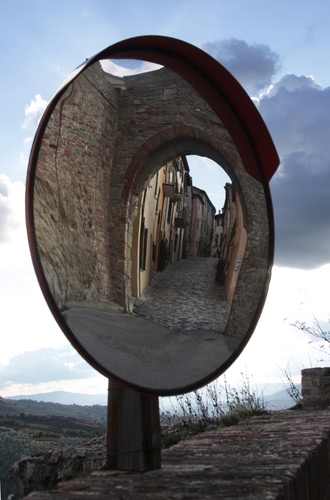 Semplificando: L'ingresso al borgo (medievale)di San Leo riflesso con effetto fisheie. In pratica un gioco.. |
