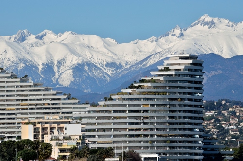Moderne costruzioni (e più antiche) a Velleneuve-Loubet, Costa Azzurra. Sullo sfondo il magnifico scenario delle Alpi Marittime.