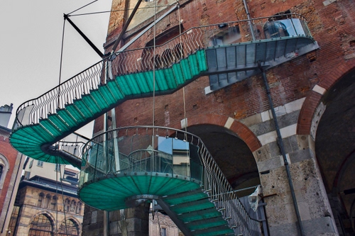 **Architettura moderna per una scala di accesso al primo piano dell'antico Palazzo della Ragione in Piazza dei Mercanti a Milano.