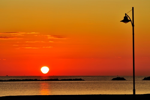 Fra le tante foto che ho scattato in occasione dell'alba, ritengo che questa sia la più rappresentativa ed essenziale nella sua semplicità, le linee scure del molo e del lampione, in qualche maniera abbracciano il momento solenne del sorgere del sole, mancano i due innamorati che si baciano sotto il lampione, ma purtroppo l'alba è il tipico evento che si verifica al mattino presto.