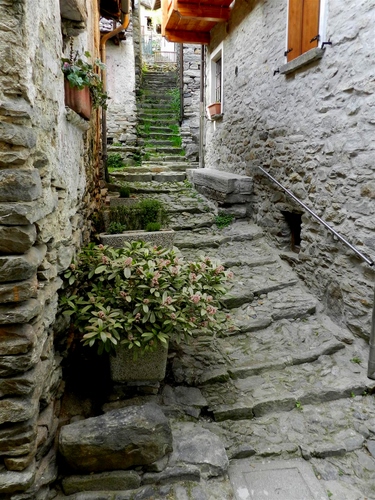 Pianazzola (pianazöla, m. 635), grumo di case arroccato non su un vero e proprio piano, come vorrebbe suggerire il nome, espressione più di un sogno che di una realtà, ma su una striscia del versante dove la pendenza si fa un po’ meno severa.Un paesino che profuma intensamente di atmosfere ottocentesche, romantiche, che possiamo ancora sorprendere e che ci sorprendono nel reticolo degli stretti viottoli e vicoli, nelle ripide scalette, nei minuscoli orti, nei balconi ben curati, nelle finestre strombate, nella policromia delle facciate, mai monotone, mai monocordi, che vivono del connubio del legno e della pietra, negli scorci dove le diverse ore del giorno restituiscono cangianti e leggeri giochi di luce. (Massimo Dei Cas, www.paesidivaltellina.it)