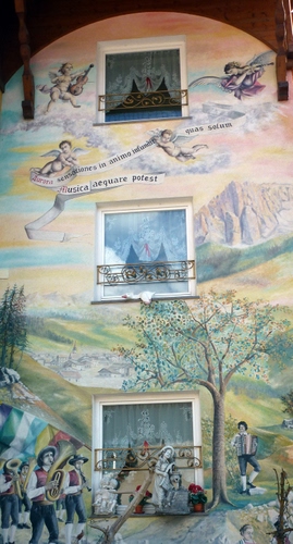Pozza di Fassa, Meida, un caratteristico murales all'Hotel Aurora dove si può leggere in latino: