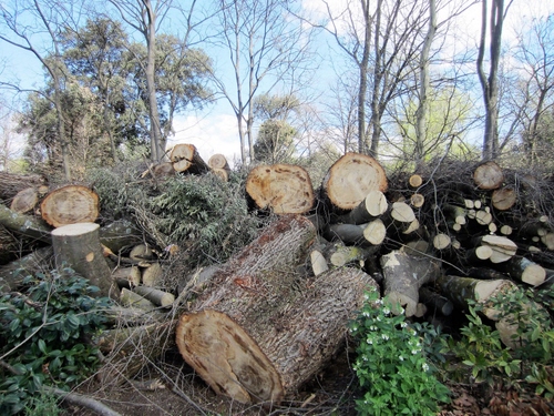 Cataste di tronchi abbattuti dalla tempesta alle Cascine.