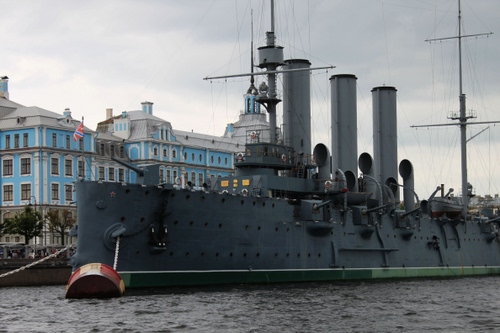 L'incrociatore Aurora, ancorato a San Pietroburgo. Da questa nave partì il colpo di cannone che diede inizio alla Rivoluzione Russa dell'ottobre 1917.