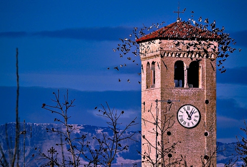 Altri tag (senza riscontro): volo, molti, orizzonte, bifora, bianco, quadrante, romani, sfere, nuvole, celeste, blu, stormo, borgo, colonnine, montagne, colombi.