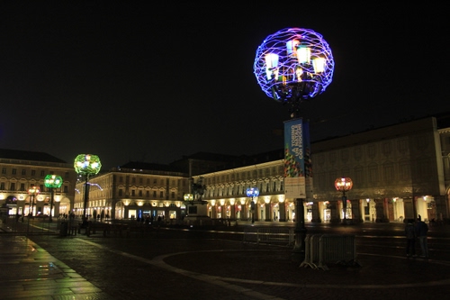 I lampioni di piazza San Carlo a Torino, durante le feste natalizie, vengono rivestiti con una serie di luci colorate che danno un altro senso ai lampioni stessi