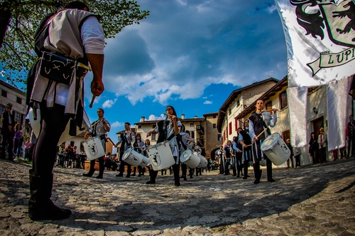 Altri tag (senza riscontro): gruppo, folcloristico, gonfalone, bianco, pavimento, bandiere, file, tamburini, marrone, costume, figuranti, ragazzi, manifestazione, celeste, sfilata, finestre, stendardi, bacchette, timpani, selciato, paese, ombre, medioevo, persone.